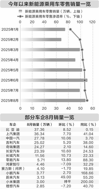 证券时报·数据宝根据乘联分会数据统计,今年以来,新能源乘用车已连续6个月零售渗透率超过50%,8月零售渗透率再创月度新高,并且首次突破55%。