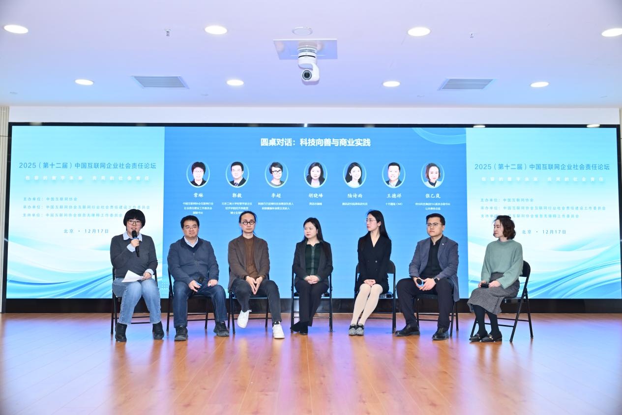 中国互联网协会互联网行业社会责任建设工作委员会副秘书长常琳主持圆桌对话环节,与北京工商大学经管学部主任、经济学院经济系教授、博士生导师郭毅,阿里巴巴亚博科技创意部负责人、阿里健康体创意及发起人李超,美团总编辑胡晓峰,腾讯研究院高级研究员陆诗雨,十方融海CMO王德祥,信也科技集团ESG委员会秘书长、公共事务总监张乙岚围绕“科技向善与商业实践”主题展开了深入的探讨和交流。