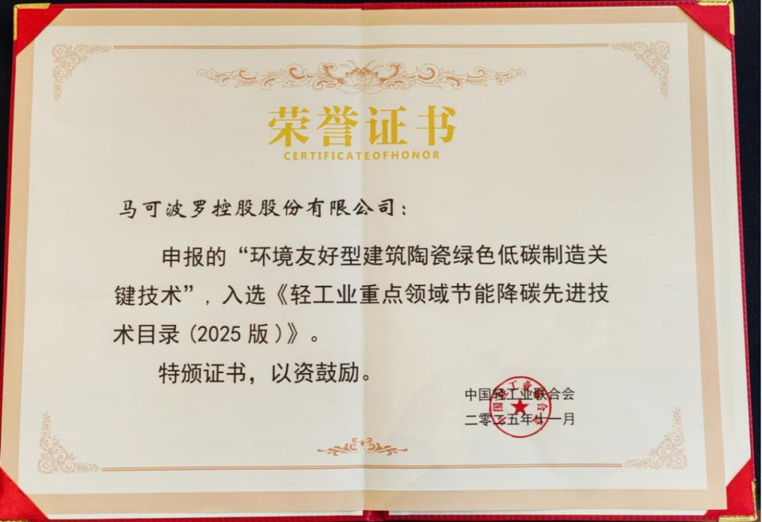 此次入选《轻工业“十四五”先进科技创新成果》及《轻工业重点领域节能降碳先进技术目录(2025版)》,是对马可波罗控股长期践行绿色发展理念、深耕低碳技术创新的充分肯定。未来,马可波罗将持续加大研发力度,积极推动绿色制造技术创新与实际应用,以实际行动助力绿色低碳高质量发展,为建设美丽中国贡献自己的一份力量!