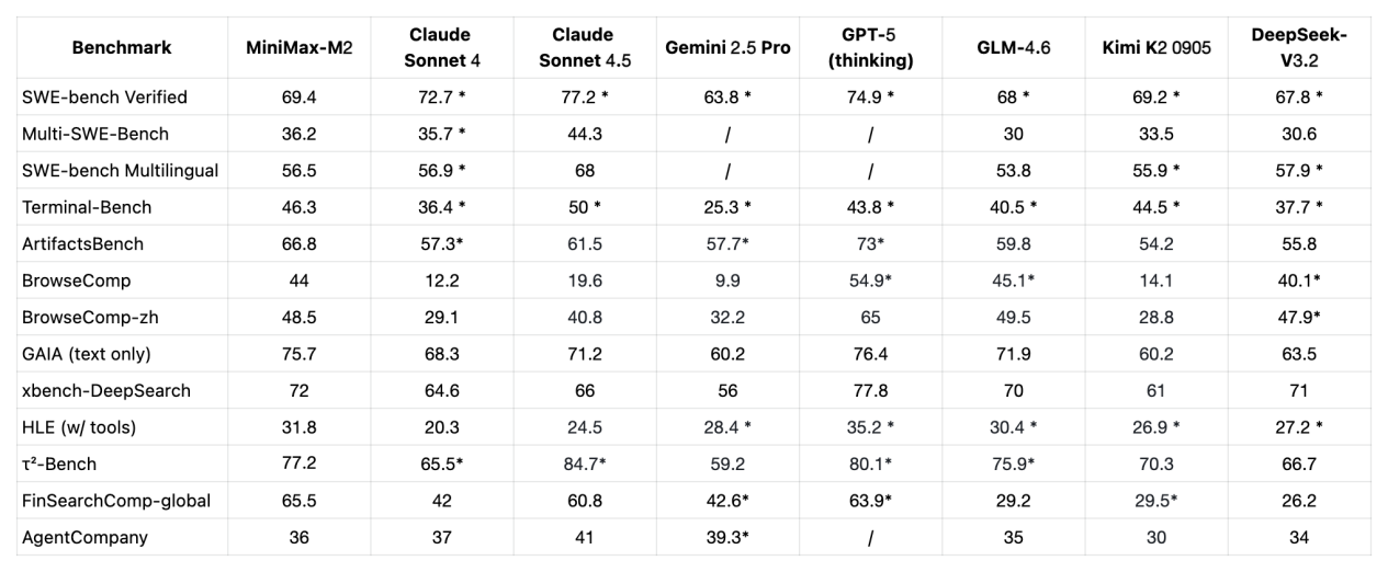 MiniMax M2 在 SWE-bench、Terminal-Bench 等聚焦端到端编码与智能体工具使用的基准测试中表现优异,这些测试与开发者日常工作高度相关。它具备多文件处理、“编码 - 运行 - 调试 - 修复” 完整开发能力,能协同调用 Shell、浏览器等复杂工具链,在信息挖掘、追溯及自我纠错上表现突出,既在基准测试中成绩亮眼,也在生产环境中具备强实用价值。