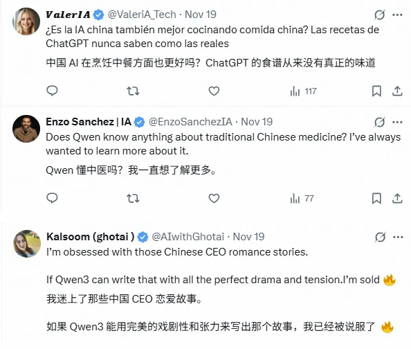 11月17日,阿里巴巴集团的海外社交平台官方宣布千问APP,“馋哭”海外网友。西班牙网友“抱怨”:““我已经看了很多(千问的)评价,但没有中国账号根本没法下载它”,法国网友则调侃:“老实说,千问Qwen对中国文化的理解,肯定比任何美国AI都深吧?”日本网友则对千问大模型参与全球AI竞争表现出无限羡慕,期待千问APP正式推出国际版;美国网友则直言“免费?那ChatGPT可能要失去我的续费了!”