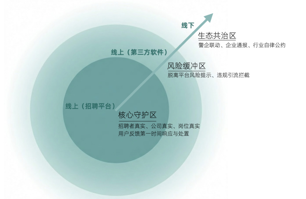 2025年,BOSS直聘根据求职场景与风控系统覆盖能力,将求职安全保护拆分为核心守护区、风险缓冲区与生态共治区,并联合多方进行全域共治。