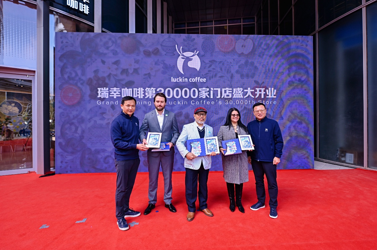 (大钲资本董事长兼首席执行官、瑞幸咖啡董事长黎辉(左一),瑞幸咖啡联合创始人、首席执行官郭谨一(右一)向印度尼西亚共和国驻华大使周浩黎(中)、巴西出口投资促进局亚太区总经理维克多(左二)、哥伦比亚驻广州总领事安雅(右二)赠送纪念礼物)
