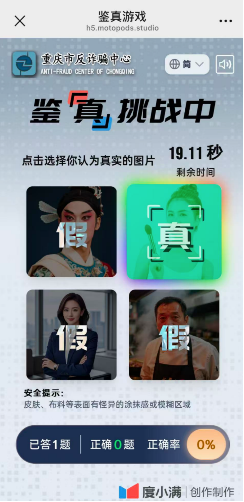 近日,重庆市反诈骗中心和度小满共同推出了2026年首套AI反诈宣传系列活动,包括AI反诈短剧、国内首个数字人反诈歌曲、防深伪H5小游戏“马年反诈宣传三件套”。其中,防深伪H5小游戏“鉴真”通过模拟真实的诈骗场景,让大家在趣味闯关中掌握识别技巧。其实识破AI造假的关键,往往就藏在那些被肉眼忽视的细微瑕疵中。