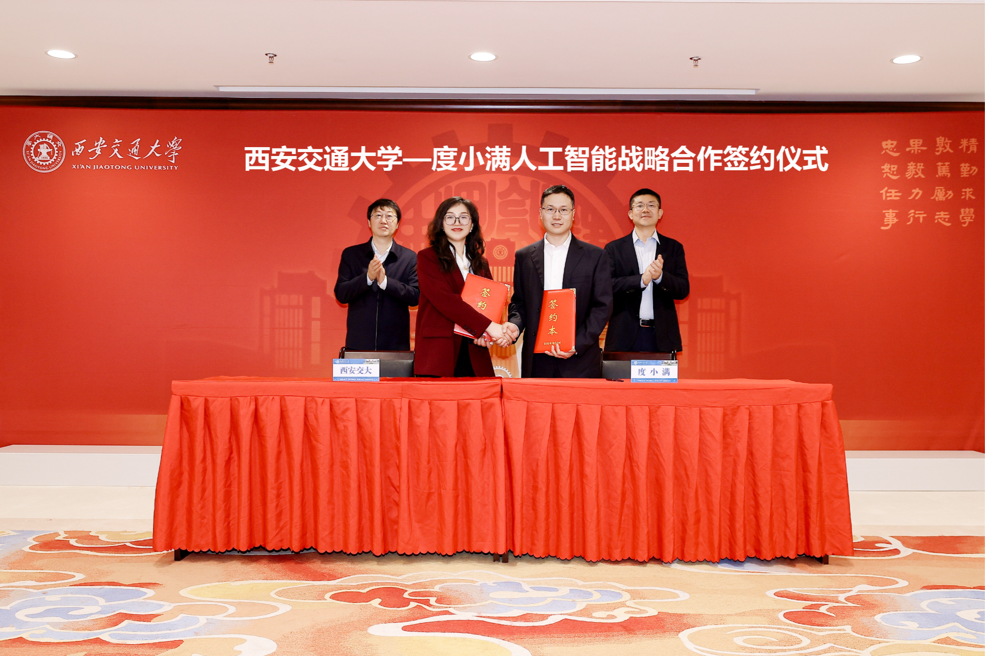 (西安交大科研院副院长陈娟、度小满CTO张文斌代表双方签署协议,西安交大校长张立群、度小满CEO朱光见证签约)