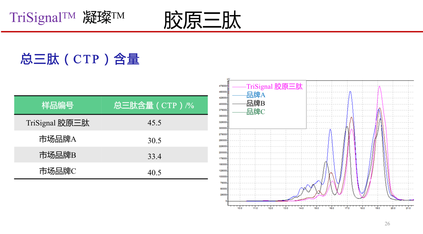 最后,赵春月博士汇报了五个女博士研究团队三年来的成果,包括发表18篇学术论文、申请26项专利。她以表没食子儿茶素没食子酸酯、竹叶黄酮和西兰花籽水提取物的复合物(EBB)为例,介绍了该成分在抑制AGEs生成、降低糖基化终产物受体表达水平方面的重要作用。值得关注的是,EBB作为五个女博士“胶原护盾技术”的核心成分,已成功应用于其胶原蛋白肽2.0系列产品中。此外,赵春月博士团队还介绍了自主研制的胶原三肽原料——“TriSignal凝璨”,其三肽含量高达45.5%,优于市场同类产品。功效研究表明,该三肽不仅能有效抑制紫外线诱导的胶原降解、显著增强皮肤屏障功能,还可提升细胞活力、抑制细胞内脂质氧化与氧化应激损伤,促进细胞增殖与皮肤损伤修复。