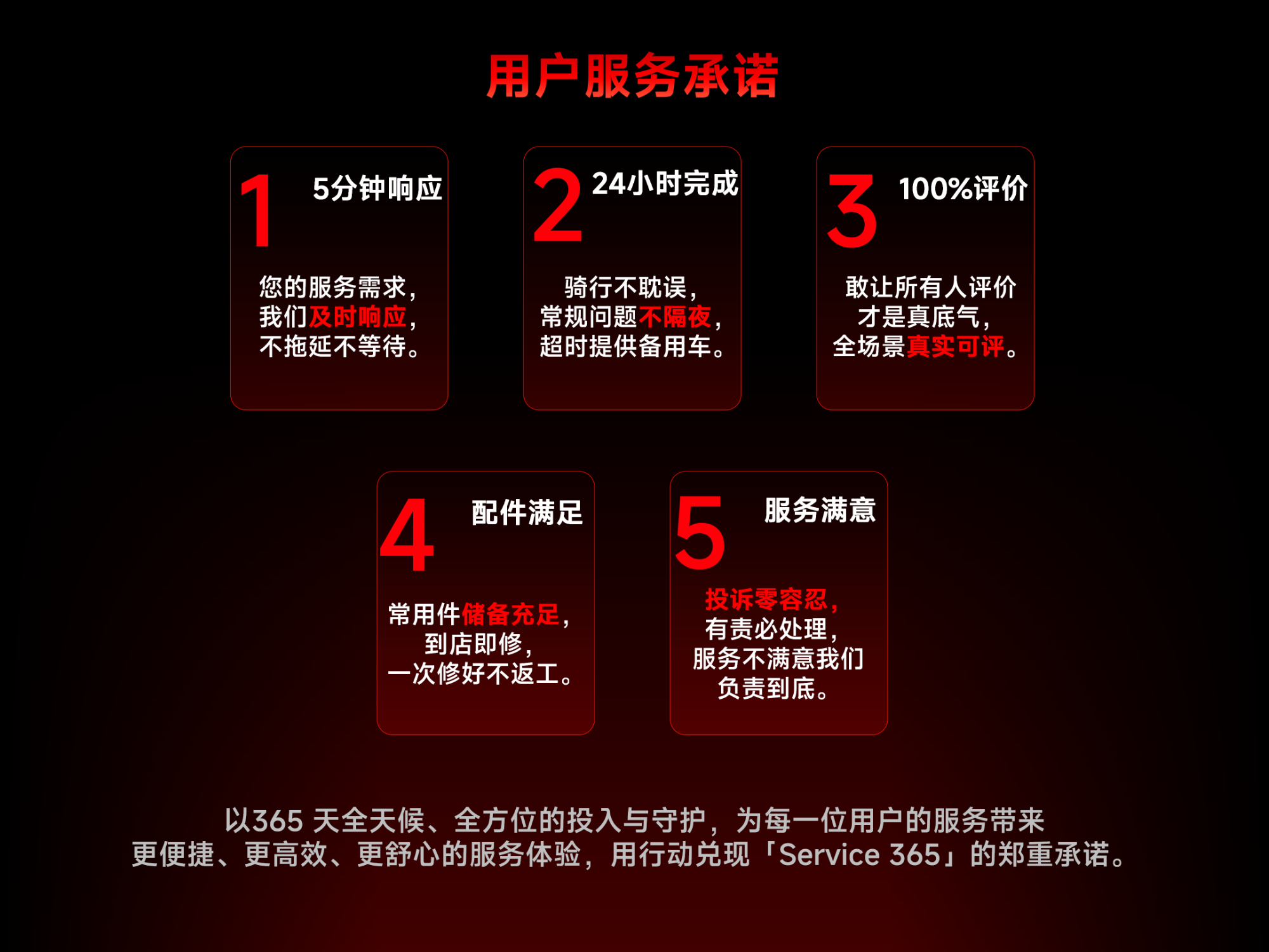 【24小时完成】 ——骑行不耽误, 常规问题不隔夜,超时提供备用车。