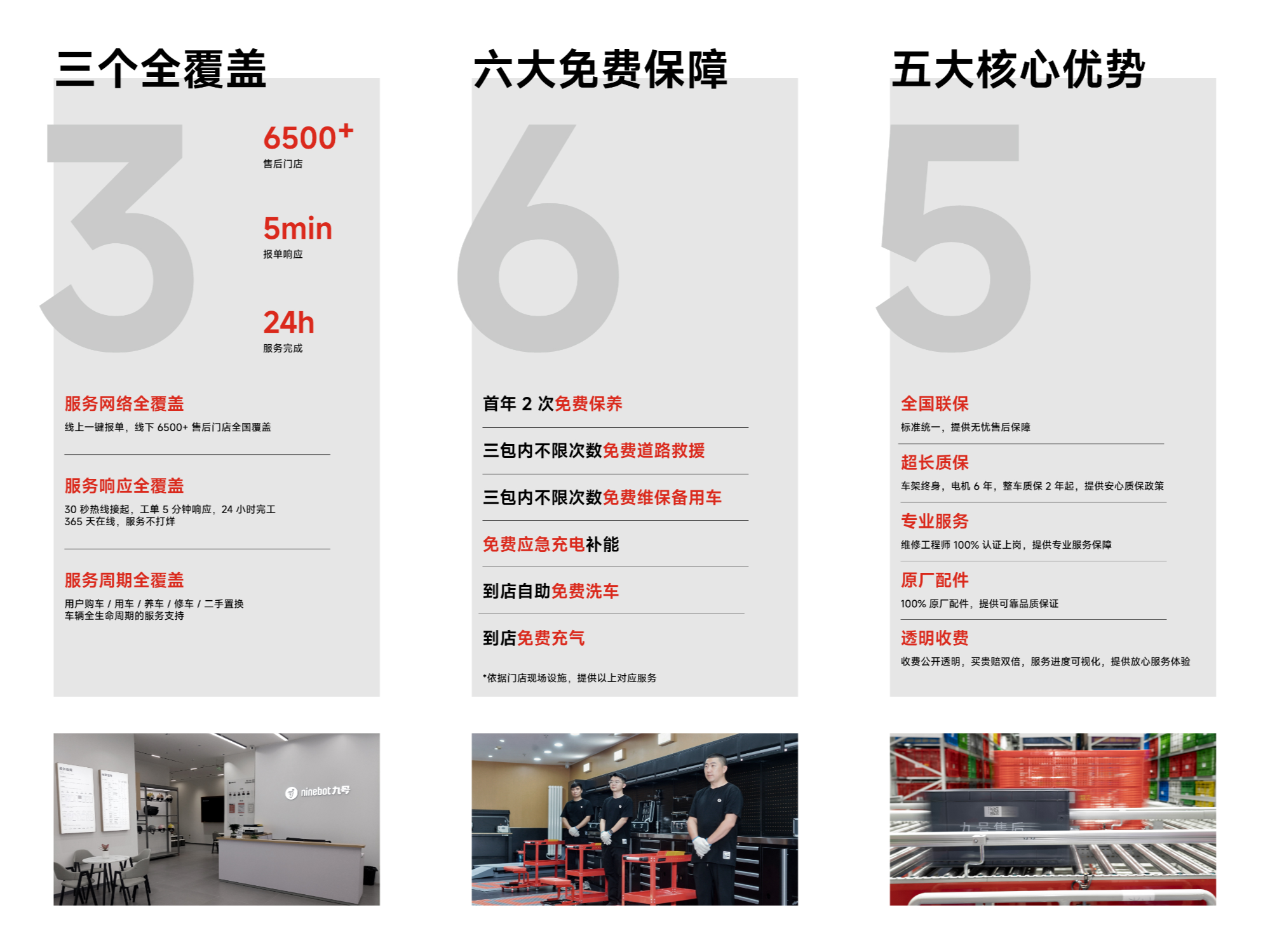 据介绍,九号“Service365”服务核心三大支柱内容包含:服务网络、服务响应、服务周期3大全面覆盖;首年 2 次免费保养、三包期内不限次数免费道路救援、三包期内不限次数免费维保备用车、免费应急充电补能、到店自助免费洗车、到店免费充气等6项免费用车保障;全国联保、超长质保、专业服务、原厂配件、透明收费等5大核心优势。