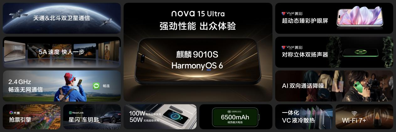 在续航与通信等基础体验层面,nova 15系列的升级,同样务实而有力。nova 15 Pro及nova 15 Ultra搭载的nova史上最大容量电池——6500mAh硅负极大电池,配合100W超级快充,以及Ultra版本首次支持的无线充电,彻底解决了用户的续航焦虑,能满足长时间外出或重度使用需求。畅连无网通信功能的加入,则确保用户即使在没有蜂窝网络和Wi-Fi的极端环境下,仍能保持基础的通信能力。